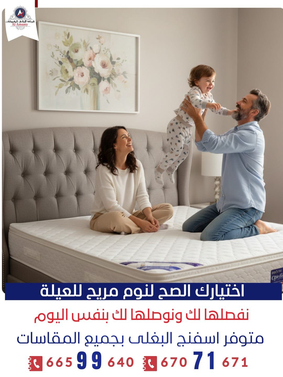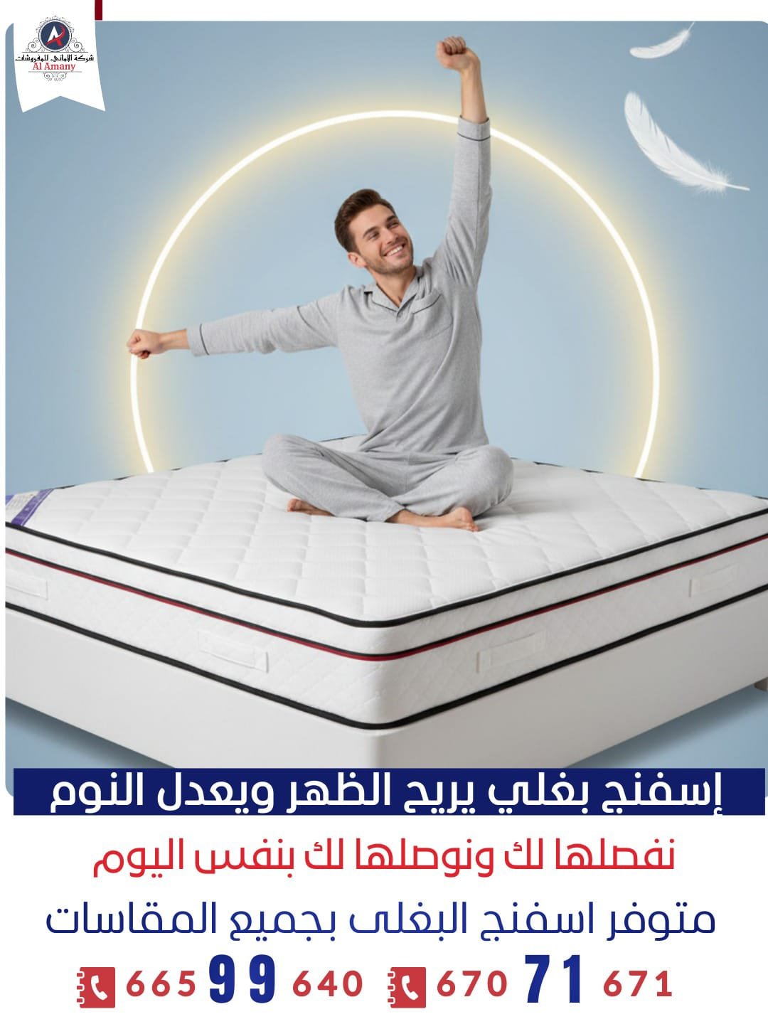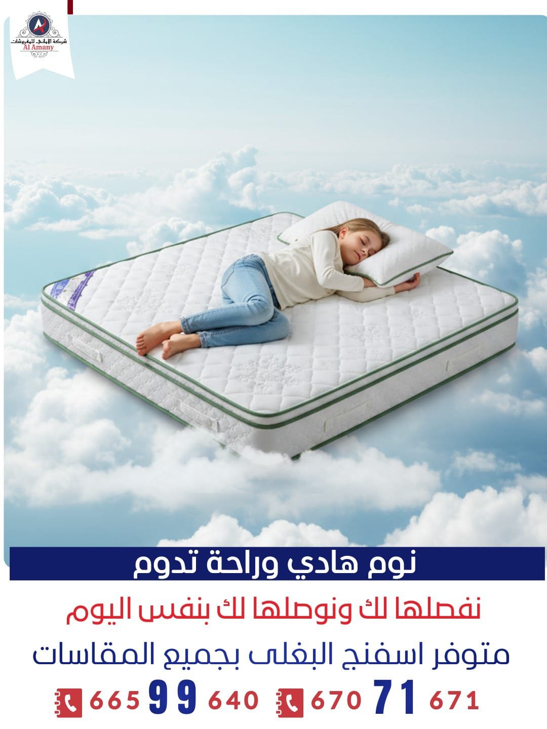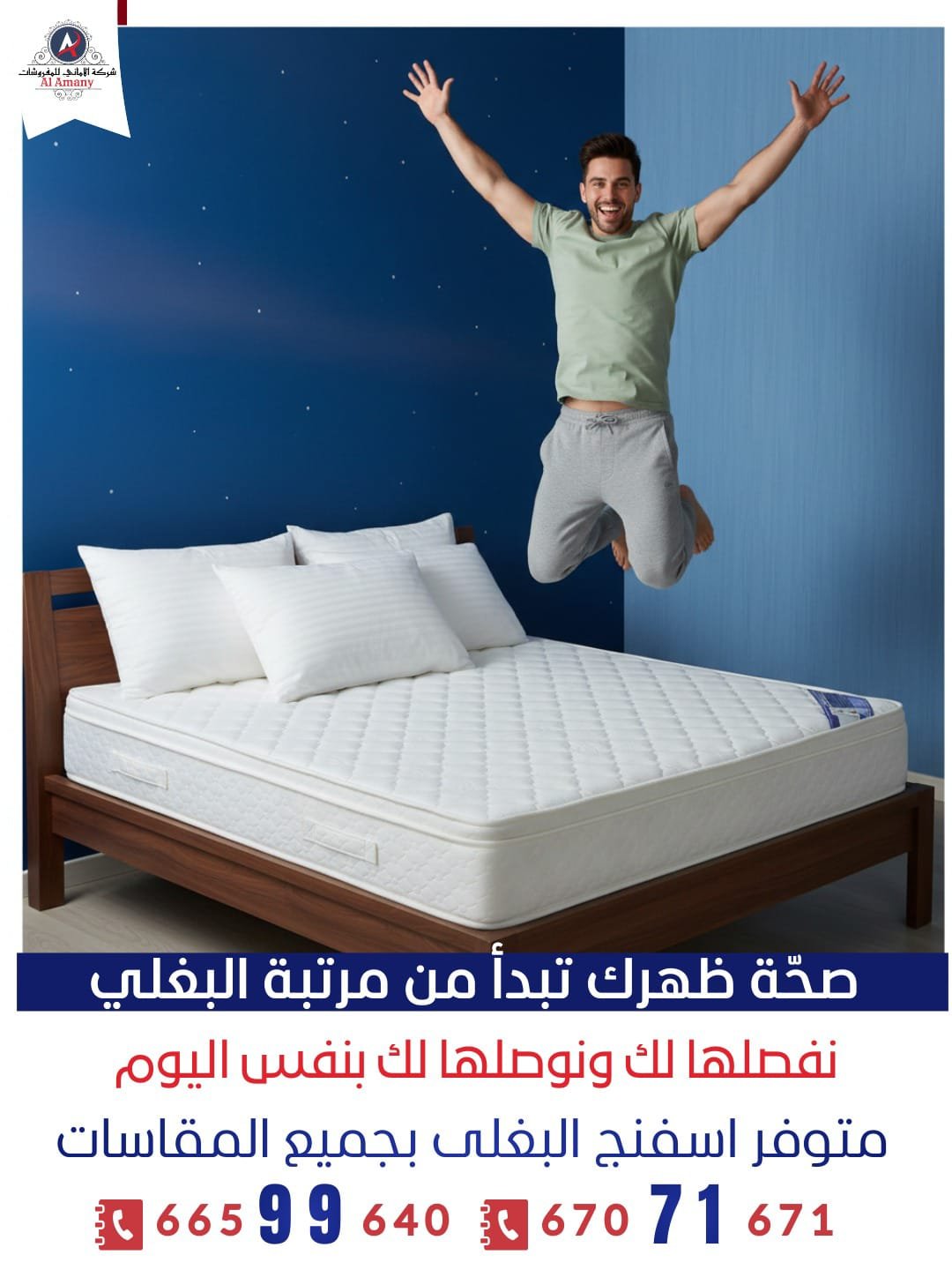 راحة نوم حقيقية تبدأ من المرتبة الصح شركة الأماني للمفروشات أتصل بنا واتساب من نحن شركة الأماني للمفروشات متخصصون في تصنيع وتوفير المراتب الطبية بخامات مختارة بعناية وجودة نعتمد عليها ونحرص على : راحة العميل أولاً.خامات قوية تعيش فترة طويلة.تصنيع حسب الطلب.اسعار تنافسية وخدمة مميزة. تواصل معنا الآن طلب تم إنجازه 0 سنوات الخبرة + 0 عملا سعداء 0 طلب قيد التنفيذ 0 معرض اعمالنا الأميرة للمفروشات ✂️ التفصيل حسب الطلب (Custom Made) تفصيل جميع المقاساتتفصيل حسب السريرتفصيل حسب الارتفاعإمكانية إرسال مندوب لأخذ المقاستصنيع بدقة وجودة عالية للتواصل واتساب 🧵 أنواع المراتب (Our Mattresses) مراتب البغلي إسفنج طبي متوازن مريحة للنوم اليومي دعم ممتاز للظهر - لا هي قاسية ولا لينة زيادة مناسبة للعائلات والكبار والصغار مراتب الجريوي إسفنج أعلى كثافة دعم أقوى للظهر ثبات أعلى وعمر أطول - مناسبة للي عندهم آلام ظهر 📐 المقاسات والارتفاعات (Sizes & Heights) المقاسات المتوفرة: SingleDoubleQueenKingتفصيل جميع المقاسات حسب الطلبالارتفاعات:7 سم9 سم15 سم20 سم25 سمنساعدك تختار الارتفاع الأنسب حسب استخدامك وراحتك. تواصل معنا الآن ⭐ لماذا تختار شركة الأماني؟ خامات أصلية دعم طبي حقيقي راحة من أول ليلة أسعار تنافسية خدمة عملاء ممتازة توصيل وتركيب 🧶 الدواشق (Fabrics & Covers) نوفر جميع أنواع الدواشق والديباجات:قماش فخم وقويملمس ناعم ومريحيتحمل الاستخدام اليومييحافظ على المرتبة ويطيل عمرهاأشكال وألوان متنوعة تواصل معنا عبر الاتصال أو واتساب خدمة متوفرة يوميًا أتصل بنا للتواصل واتساب